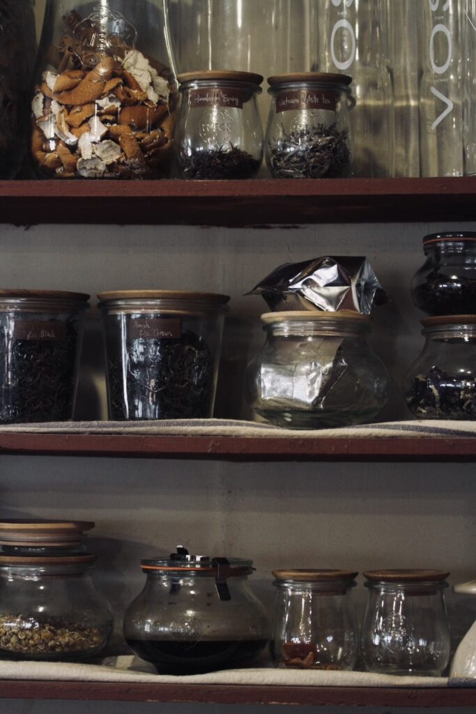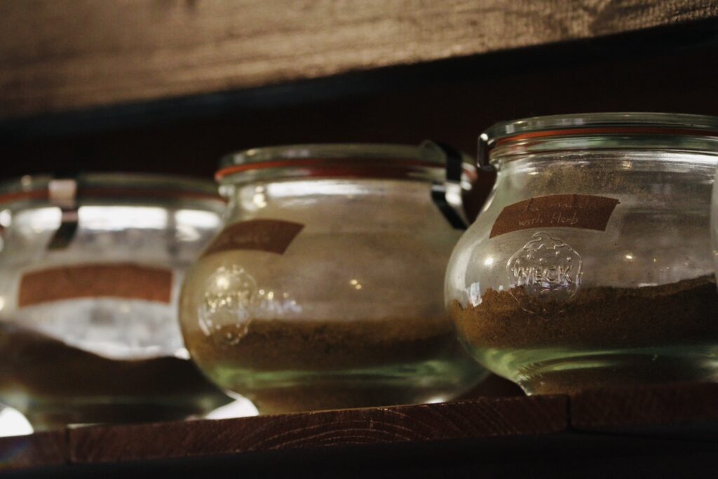 キッチンには数えきれないほどの瓶が